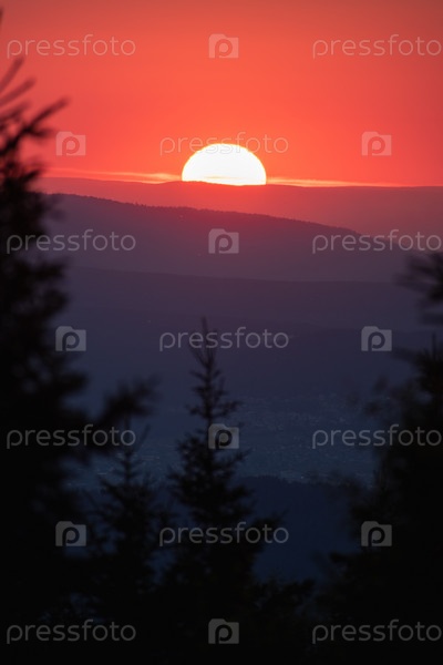 Солнце садится за слои гор на закате