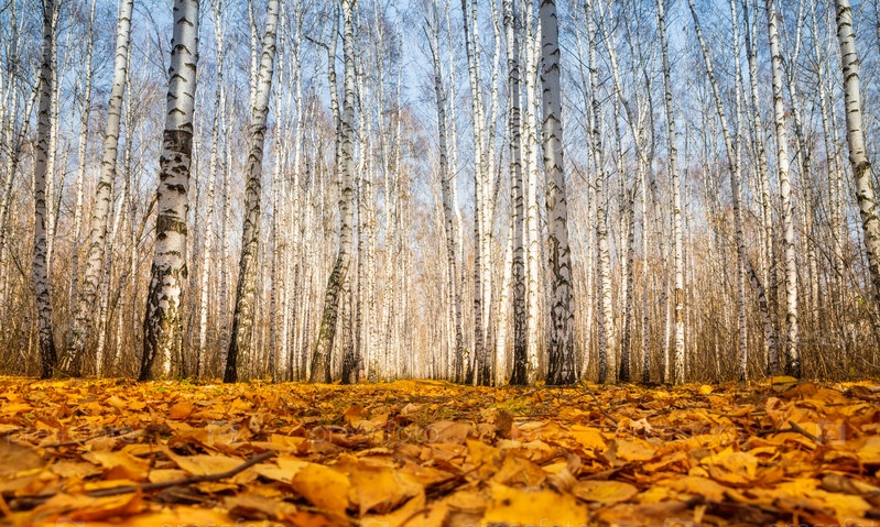 Красочный лесной пейзаж белых берез с желтыми опавшими листьями