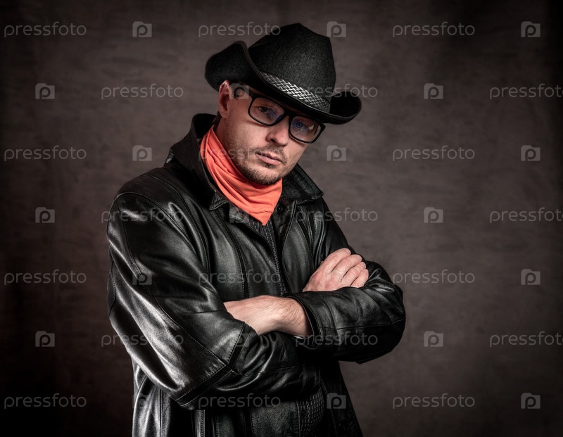 Небритый мужчина в очках, шляпе и черном плаще на темном фоне