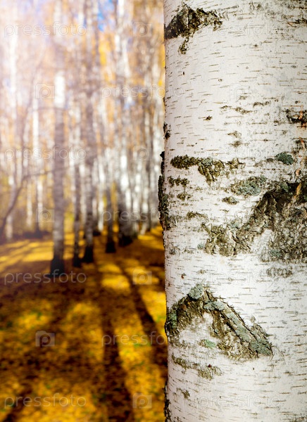 Белый ствол березы в фокусе на размытом фоне