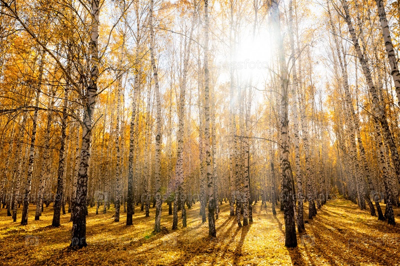 Осенняя березовая роща, освещенная ярким солнцем