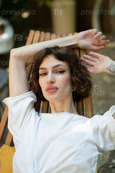 Молодая красивая женщина сидит в деревянном стуле на улице летом