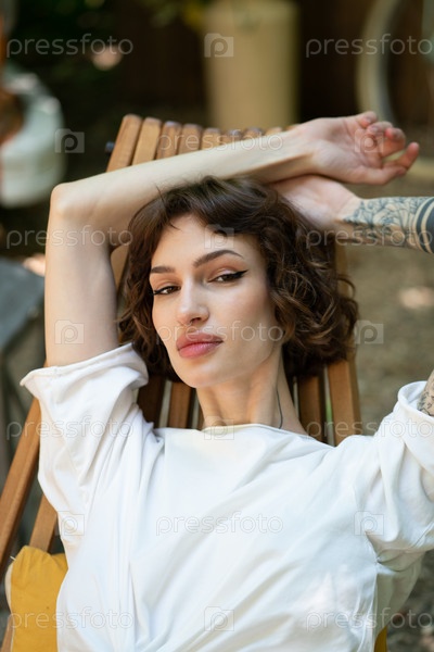 Молодая красивая женщина сидит в деревянном стуле на улице летом
