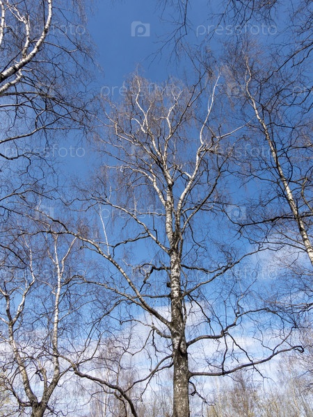 Зимний березовый лес в солнечном свете на фоне голубого неба