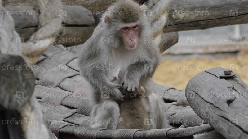 Мама японской макаки-снежной обезьяны заботится о малыше-обезьянке