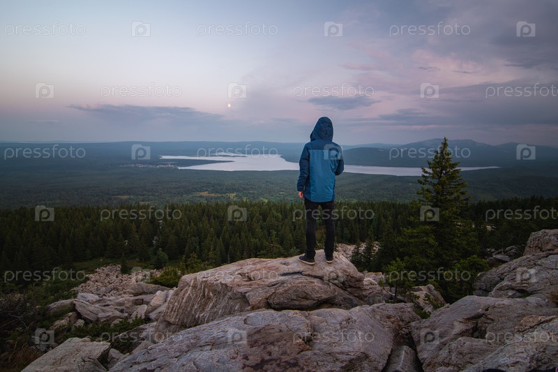 Мужчина в синей куртке на вершине горы смотрит на долину и озеро