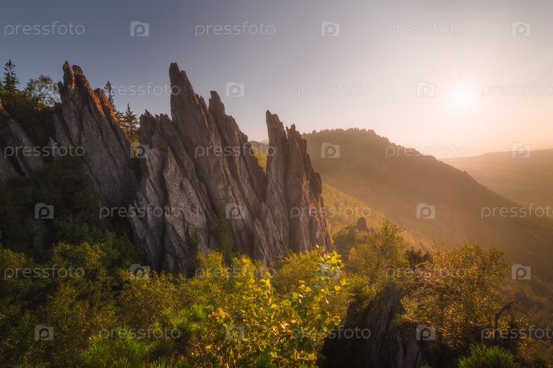Восход солнца рано утром в горах. Национальный парк Таганай, Двуглавая Сопка, Перья