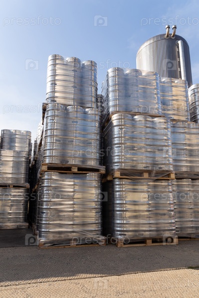 Большое количество алюминиевых пивных бочонков, сложенных друг на друга европоддонами и обернутых виниловой фольгой. Готовое к отгрузке пиво разливается в кеги и хранится во дворе пивоварни
