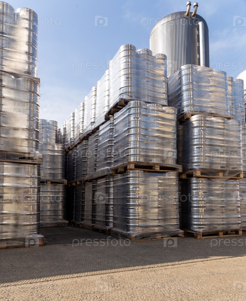 Большое количество алюминиевых пивных бочонков, сложенных друг на друга европоддонами и обернутых виниловой фольгой. Готовое к отгрузке пиво разливается в кеги и хранится во дворе пивоварни