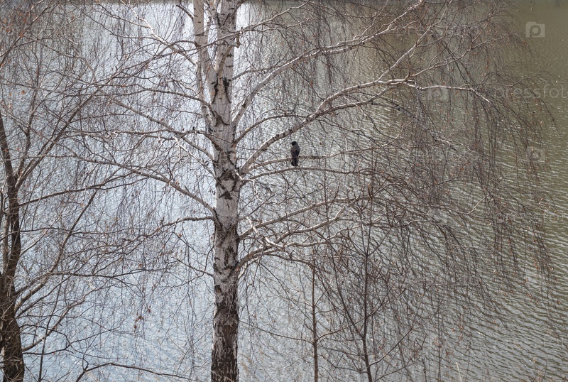 Ворона сидела на фоне озера и сухих ветвей деревьев