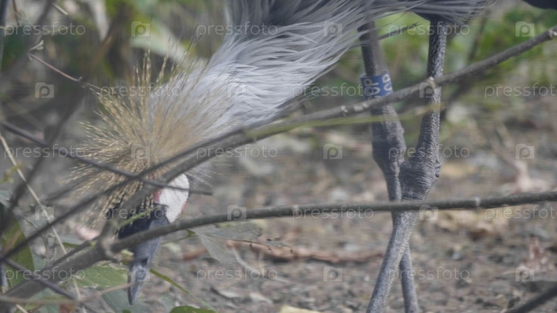 Красивая птица, серый венценосный журавль с голубыми глазами и красным плетнем