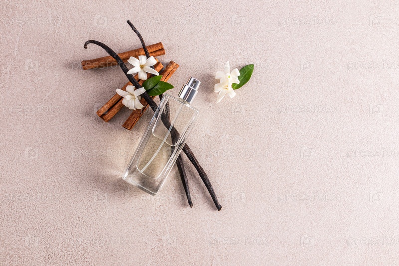 Элегантный прозрачный флакон с нежным ароматом женских духов лежит на ванильных палочках и цветках. Вид сверху. Копировальное пространство
