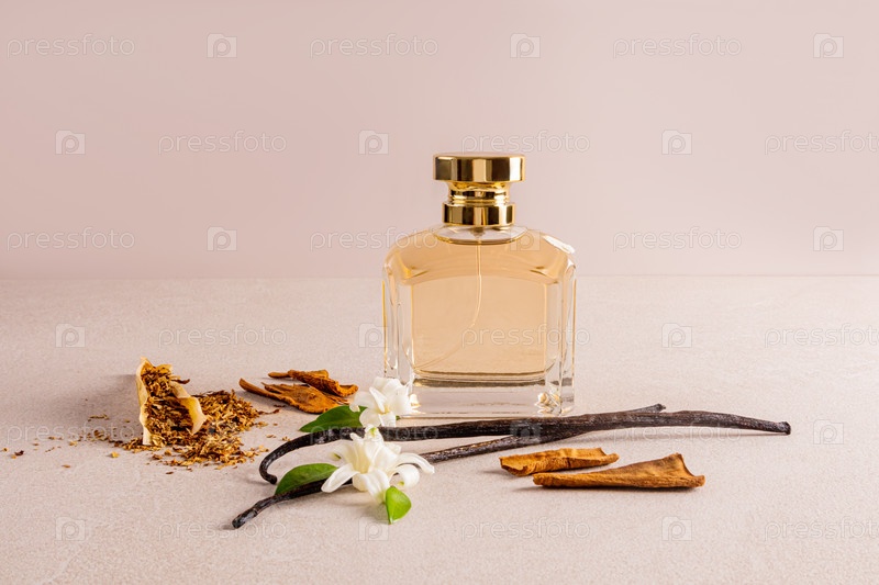 Флакон духов с золотой крышкой с роскошным ароматом ванили и табачных нот на бежевом каменном фоне с натуральными ванильными палочками и табаком
