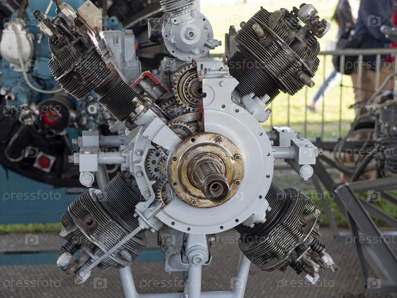 Старый авиационный двигатель с деревянным пропеллером, винтажный самолет крупным планом