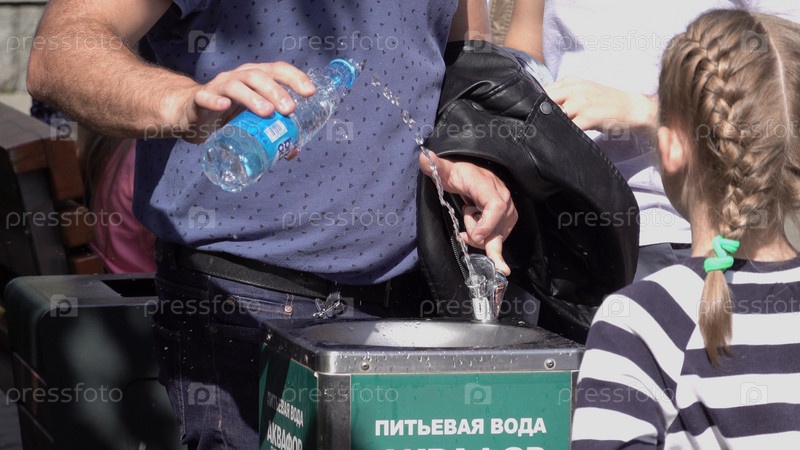 МОСКВА - 24 июля 2019 года: Мужчина набирает воду из фонтана в бутылку для питья 24 июля 2019 года в Москве, Россия