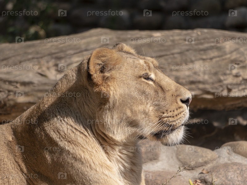 Портрет львицы, греющейся под теплым солнцем после ужина