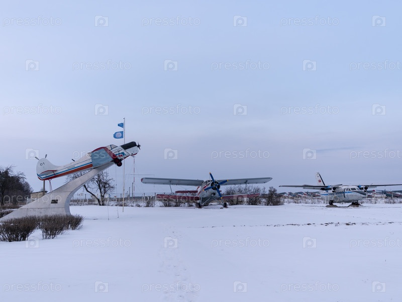 САСОВО, РОССИЯ - 09 ФЕВРАЛЯ 2018 г.: Самолет Як-18 на постаменте в аэропорту 09 февраля 2018 г. в Москве, Россия