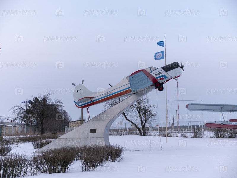 САСОВО, РОССИЯ - 09 ФЕВРАЛЯ 2018 г.: Самолет Як-18 на постаменте в аэропорту 09 февраля 2018 г. в Москве, Россия