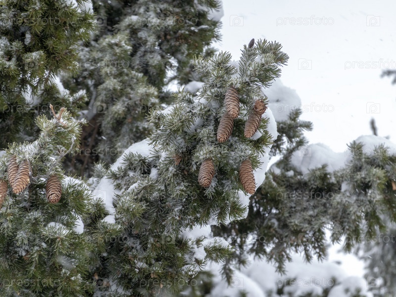 Красивая еловая ветка с шишками в снегу