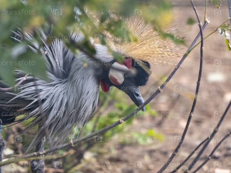 Красивая птица, серый венценосный журавль с голубыми глазами и красным плетнем