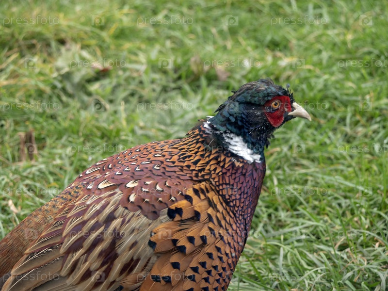 Цесарка гуляет по зеленой траве осенью