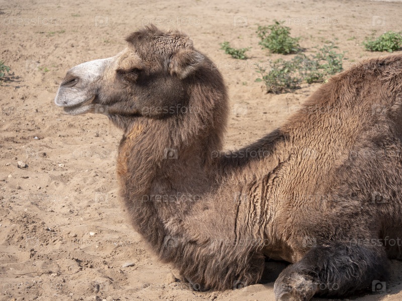 Портрет изящного двугорбого верблюда, отдыхающего в тени