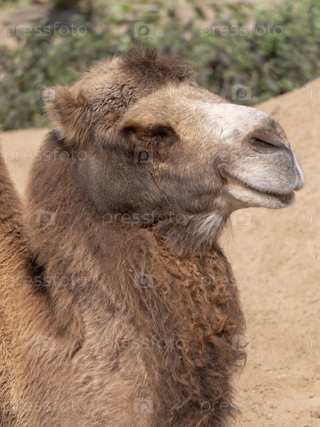 Портрет изящного двугорбого верблюда, отдыхающего в тени