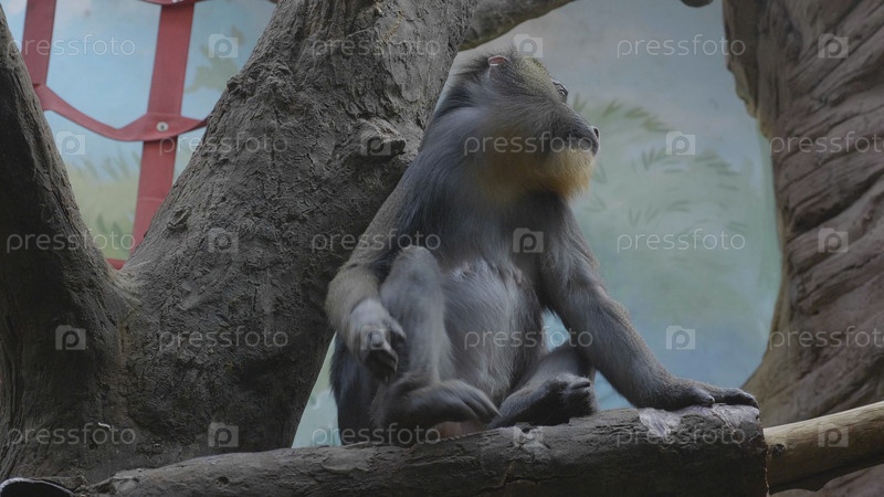 Красочный мандриль Mandrillus sphinx, сидит на дереве и царапает ногу