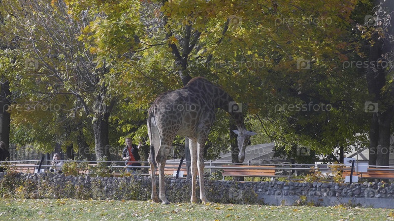 Большой жираф наклонился, чтобы поднять ветку