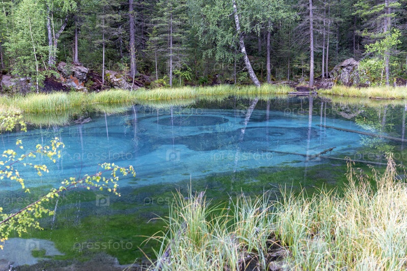 Удивительное голубое гейзерное озеро в горах Алтая, Россия