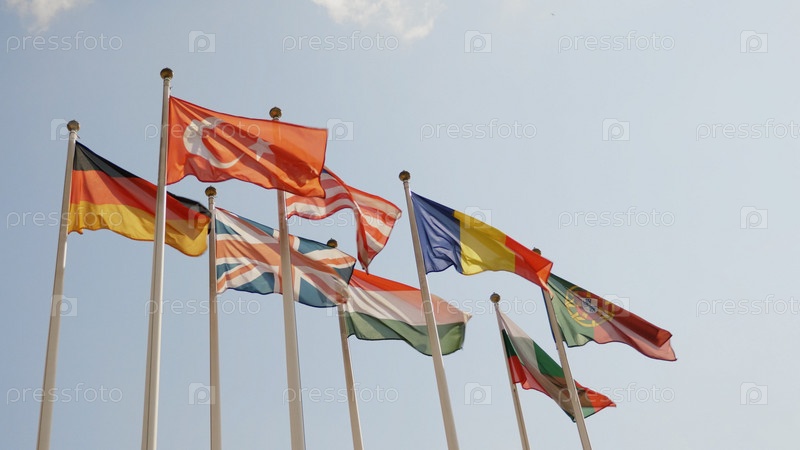 Различные национальные флаги стран под голубым небом