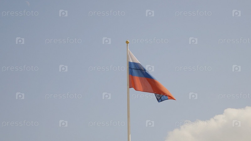 Российский флаг на флагштоке развевается на ветру на фоне голубого неба с облаками