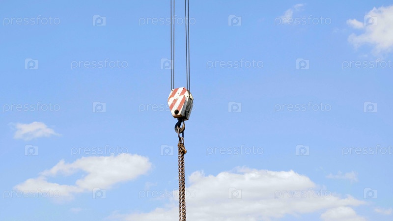 Крюк крана с висящими красными и белыми полосами, голубое небо на заднем плане, Крюк крана с висящими красными и белыми полосами, голубое небо на заднем плане