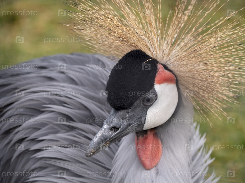 Красивая птица, серый венценосный журавль с голубыми глазами и красным плетнем