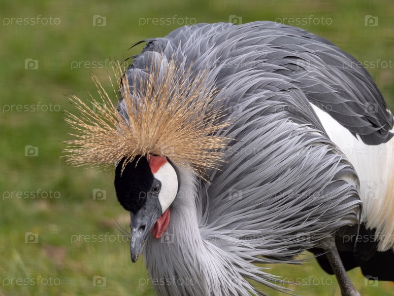 Красивая птица, серый венценосный журавль с голубыми глазами и красным плетнем