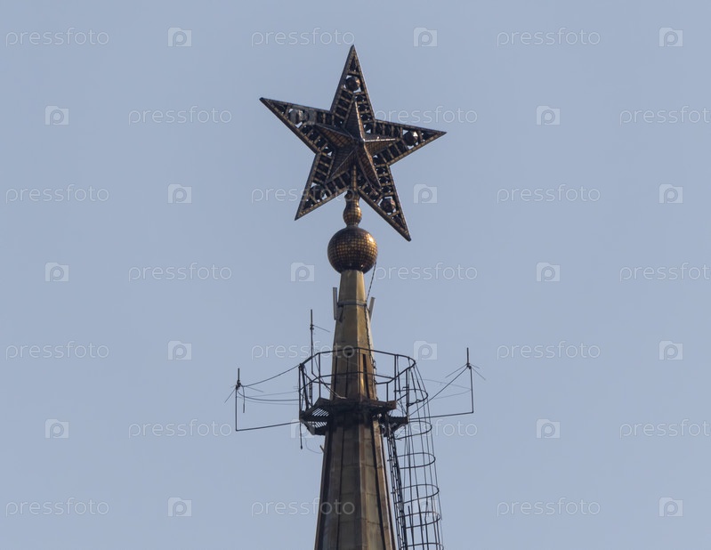 МОСКВА, РОССИЯ, 10 июня 2019 г.: Рубиновая звезда на шпиле Спасской башни Московского Кремля 10 июня 2019 г. в Москве, Россия