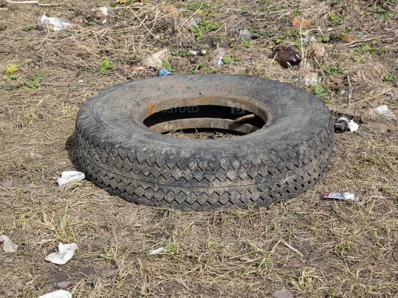 Изношенная автомобильная шина валяется в грязи и луже на земле. Загрязнение окружающей среды. Экологические проблемы