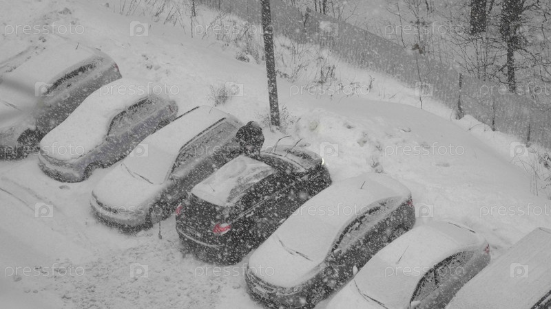 МОСКВА - 10 января: водитель чистит снег с лобового стекла 10 января 2018 года в Москве, Россия