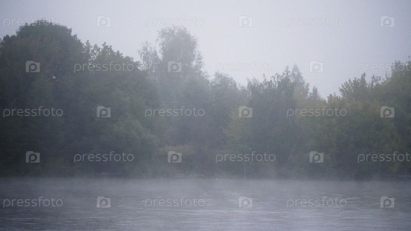 Рано утром на реке в лесу в тумане над водой