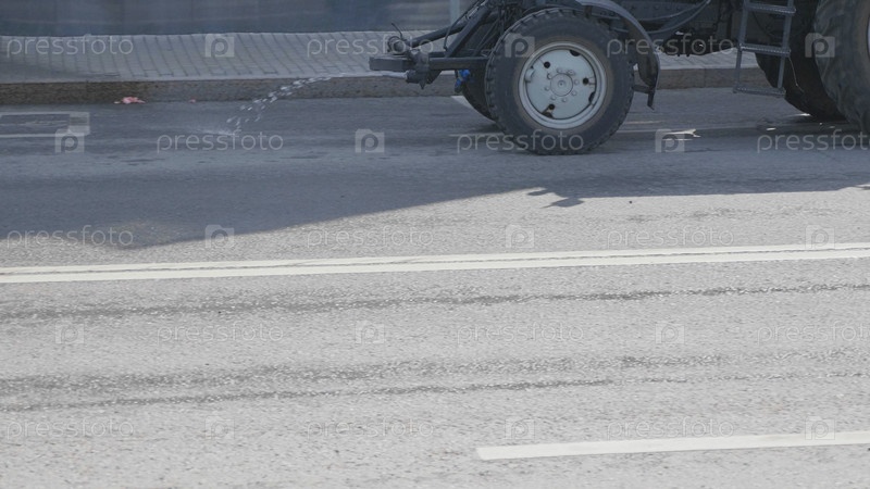 МОСКВА - 25 ИЮЛЯ: На городской улице работает поливочная машина 25 июля 2019 года в Москве, Россия