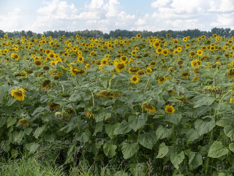 Поле цветущих подсолнухов с пчелами, собирающими мед