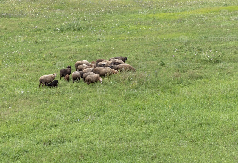 Группа овец смотрит, гуляет и отдыхает на зеленом пастбище в горах Алтая. Сибирь, Россия
