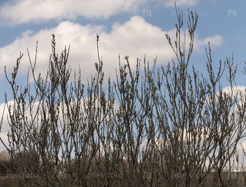 Красивые ветви вербы на фоне голубого неба, праздник Пасхи в Вербное воскресенье