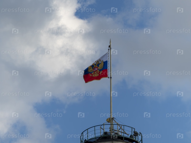 Российский флаг развевается на ветру на флагштоке