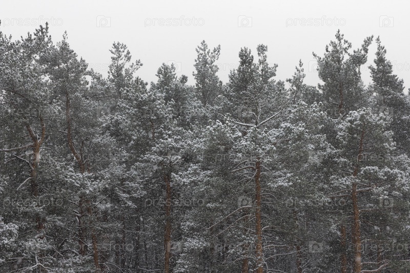 Красивый зимний лес после снегопада, ветки покрытые снегом