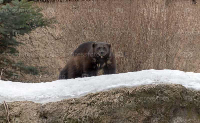 Большая дикая росомаха в зимнем лесу на охоте