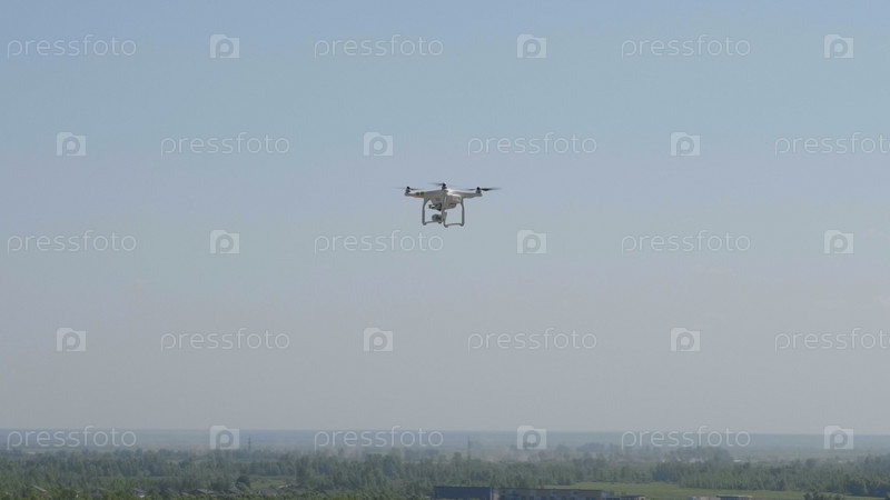 Летающий вертолет-дрон на фоне белых облаков
