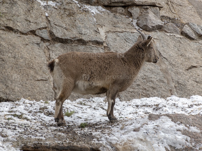 Красивый горный козел со спиральными длинными рогами на фоне скал