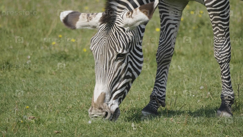 Африканская красивая зебра есть свежую зеленую траву