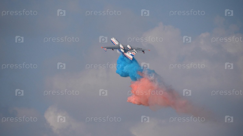 Москва Россия Аэродром Жуковский 31 августа 2019 года: Демонстрационный полет реактивного многоцелевого самолета-амфибии Бе-200 на международном аэрокосмическом салоне МАКС-2019
